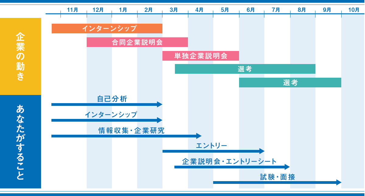 以下の画像は、2019年卒の就活スケジュールです。[出典元:Rakutenみん就]