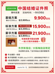 1,💍 基础方案:9,900日元(原价12,500) ✔ 专业拍摄+修图 ✔ 可选原尺寸/L size/结婚证用尺寸电子版 ✔ 纸质版证件照4张 ❌ 不含妆发(需要自己提前化好妆)