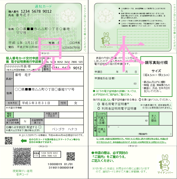 券面に氏名、住所、生年月日、性別、マイナンバー(個人番号)と