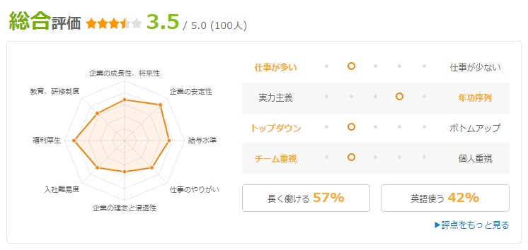 その他、知りたい企業の総合評価をグラフで確認する事も出来ますので、1件1件口コミを確認する必要が無く、一目で企業の評価を知りたい方にオススメです。